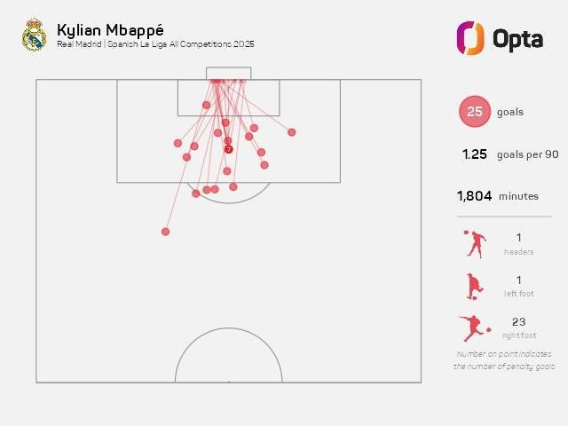 此役客场对阵毕尔巴鄂竞技,姆巴佩在比赛第7分钟接阿诺德长传后在禁区外远射破门,帮助皇马取得1-0领先。据统计,姆巴佩本赛季代表皇马在各项赛事已打入5粒禁区外进球,比五大联赛其他任何球员都要多。