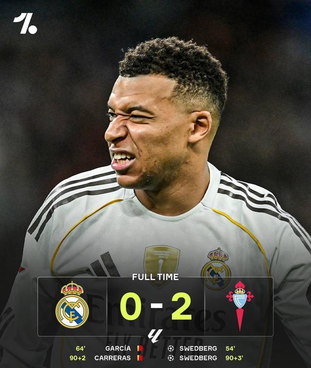 尽管皇马在上半场掌控62%控球率,但无论是贝林厄姆的头球攻门还是维尼修斯的低射均被对方化解,难以打破前45分钟的僵局,0-0。下半场再战,皇马局势可谓急转直下。第54分钟,萨拉戈萨左侧传中,斯韦德贝里将球碰入网中,塞尔塔打破僵局,比分0-1!