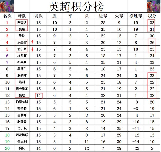 积分榜方面,阿森纳近段时间无力赢硬仗,被曼城不断缩小差距,本轮过后阿森纳就只剩下2分优势了。近段表现更差的切尔西排名更是一跌再跌,从第2跌到第4,今天水晶宫绝杀赢球后,更是将切尔西挤出前4。利物浦被布莱顿超过后,又回到第9的位置。