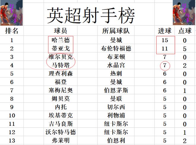 射手榜方面,哈兰德15球领跑,蒂亚戈11球排名第2,马特塔今天没有进球,还是和维尔贝克7球并列第3。内托,埃基蒂克,姆贝莫等人5球刚好挤入前十。