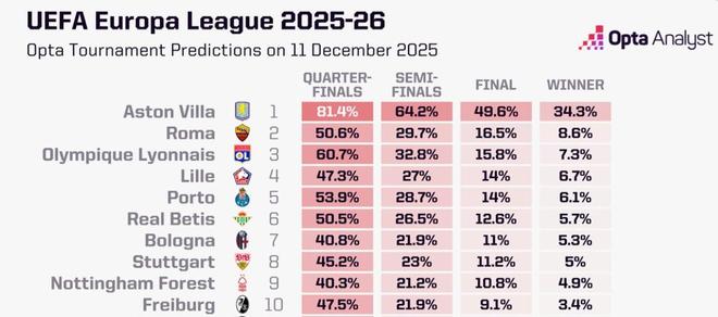Opta预测本赛季欧联杯夺冠概率TOP10:1. 阿斯顿维拉(1/4决赛81.4%,半决赛64.2%,决赛49.6%) 34.3%2. 罗马(1/4决赛50.6%,半决赛29.7%,决赛16.5%) 8.6%3. 里昂(1/4决赛60.7%,半决赛32.8%,决赛15.8%) 7.3%4. 里尔(1/4决赛47.3%,半决赛37%,决赛14%) 6.7%5. 波尔图(1/4决赛53.9%,半决赛28.7%,决赛14%) 6.1%6. 皇家贝蒂斯(1/4决赛50.5%,半决赛26.5%,决赛12.6%) 5.7%7. 博洛尼亚(1/4决赛40.8%,半决赛21.9%,决赛11%) 5.3%8. 斯图加特(1/4决赛45.2%,半决赛23%,决赛11.2%) 5%9. 诺丁汉森林(1/4决赛40.3%,半决赛21.2%,决赛10.8%) 4.9%10. 弗赖堡(1/4决赛47.5%,半决赛21.9%,决赛9.1%) 3.4%【上咪咕独家看英超】