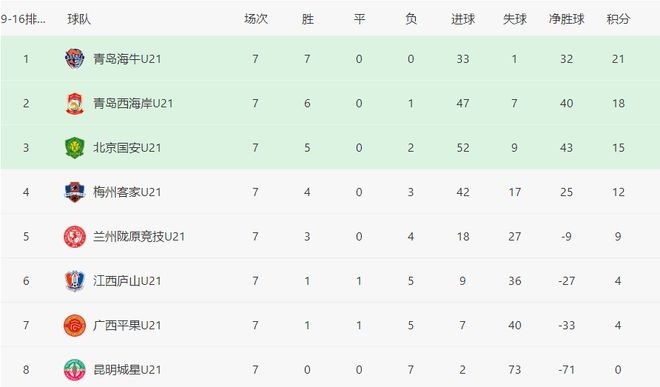 12月7日,2025中国足球青少年精英联赛(U21组)决赛阶段L组(9-16名排位赛)在珠海赛区展开第7轮,也就是最后1轮角逐,具体战报如下:江西庐山5-1昆明城星青岛西海岸7-0兰州陇原竞技北京国安11-1梅州客家青岛海牛7-0广西平果和前几轮一样,本轮各场次依然上演了进球大战,4场比赛共打进32球,场均8球。其中,北京国安U21队11-1大胜梅州客家U21,有些出乎意料。因为梅州客家U21前4轮攻入39球,而且0失球,展示出不俗的实力。即便是对阵最终排在该组前2名的青岛海牛U21、青岛西海岸U21,也都是0-3、2-3告负,没有大比分惨败,尤其对阵青岛西海岸U21时,一度2球领先,但后来连丢3球,最终遗憾输球。这种情况下,梅州客家U21队以1-11的悬殊比分输给北京国安U21,确实有些说不过去。值得一提的是,北京国安U21此前分别以1-2、2-4的比分,负于青岛海牛U21、青岛西海岸U21。对比之下,梅州客家U21确实输得有些惨。巧合的是,在本赛季中超收官战中,梅州客家也遭遇了北京国安,结果客场1-5惨败,悲壮降级。也许,梅州客家U21队也受到了老大哥们的影响,发挥失常吧。此消彼长的是,此前一天进行的足协杯决赛中,北京国安3-0完胜河南队,队史第5次捧起了冠军奖杯。这无疑极大提振了U21队的士气,帮助他们收获了一场大胜。上一轮,北京国安U21还以17-0的悬殊比分,大胜昆明城星U21,创造了U21联赛决赛阶段的最大分差纪录。最终,北京国安U21队以5胜2负进52球失9球积15分的战绩,位列L组第3,总成绩第11。青岛海牛U21、青岛西海岸U21以7-0的同样比分,大胜广西平果U21、兰州陇原竞技U21,完美收官。其中,青岛海牛U21豪取7连胜,而且仅丢1球,最终积21分,位列L组榜首,总成绩第9。青岛西海岸U21紧随其后,积18分,排名总成绩第10。梅州客家U21积12分,总排名第12。兰州陇原竞技U21、江西庐山U21、广西平果U21、昆明城星U21,分列总成绩第13至16。其中,昆明城星U21遭遇7连败,而且仅进2球,狂丢73球,数据有些惨。