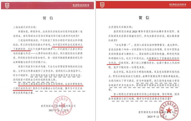 首先说重庆铜梁龙的两封贺电(上图)。给海港的贺电中点赞海港是中国职业足球的崭新标杆,对于北京国安是则认为其是首都球队的标杆和风范。不管是中超冠军还是足协杯冠军,都有机会出战亚冠精英赛。对此在贺电的最后一段,重庆铜梁龙的期待有所不同。对于将踢正赛的海港是祝愿他们“在亚洲赛场展现中国足球的风采”;对于要踢资格赛的北京国安,却对亚冠只字不提。
