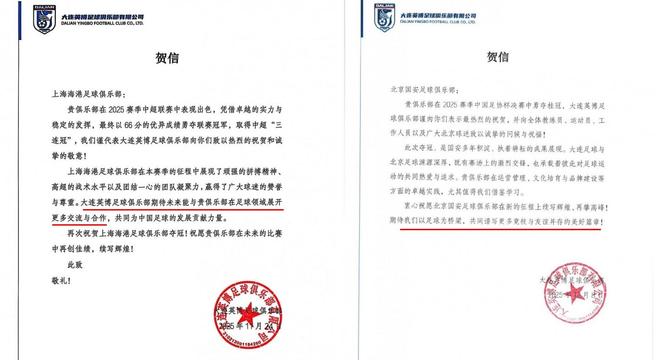 再看大连英博的两封贺电(上图)。对于上港,贺电中表示希望双方俱乐部未来在足球领域展开更多的合作交流。刘祝润从海港出租到大连英博表现不错,这应该也是大连英博重点提及这点的原因。对于北京国安,贺电中则重点谈及双方的友谊,表示希望双方以足球为桥梁,共同谱写竞技和友谊并存的美好篇章。可见对于上港和北京国安,大连英博的侧重点不同,一边是为了租借球员,另一边是为了交友。