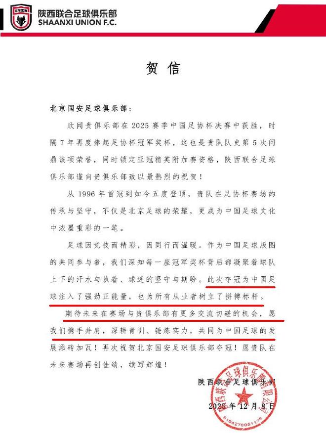 足协杯夺冠后,还有一支中甲球队给北京国安发出贺电,他们就是陕西联合足球俱乐部(上图)。该俱乐部称赞北京国安的夺冠,是为中国足球注入强劲的正能量,也为所有从业者树立拼搏标杆。最后他们希望跟北京国安在青训上有更多切磋交流。虽然海港三连冠时没见陕西联合的贺电,但2024赛季海港夺取两连冠时,当时尚在中乙的他们是发过贺电的(下图)。
